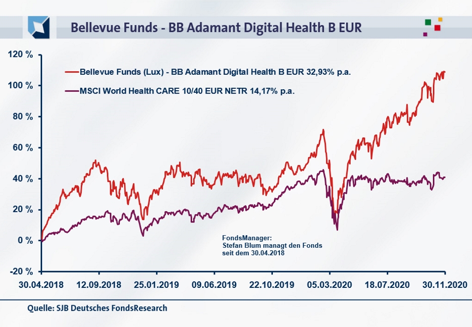 In den gut zweieinhalb Jahren seit seiner Auflegung hat der BB Adamant Digital Health B EUR eine Rendite von +32,93 Prozent p.a. in Euro erzielt (Stand: 30. November 2020). Eine ganz hervorragende Wertentwicklung, die mehr als doppelt so hoch wie diejenige des MSCI World HealthCare 10/40 EUR NETR ausfällt, den die SJB für ihre FondsAnalyse als Benchmark ausgewählt hat. Der weltweit gestreute Aktienindex für Titel aus dem Gesundheitssektor generiert im selben Zeitraum eine Euro-Rendite von +14,17 Prozent p.a. Mittelfristig liegt der Bellevue-Fonds im Performancevergleich ähnlich weit vor dem MSCI-HealthCare-Index, auch hier überzeugt das aktiv gemanagte Produkt: Über zwei Jahre hat der Digital Health-Fonds eine Rendite von +25,00 Prozent p.a. in Euro zu verzeichnen, während der globale Gesundheitsaktien-Index einen Kurszuwachs von +8,66 Prozent jährlich erwirtschaften konnte. Ein hoher Renditevorsprung im letzten Einjahreszeitraum rundet die überzeugende Performancehistorie des Bellevue-Produktes ab: Das Plus von +39,53 Prozent ist deutlich stärker ausgeprägt als die Euro-Rendite von +4,96 Prozent, mit der der MSCI-Vergleichsindex aufwarten kann. Die über alle untersuchten Perioden erzielte Mehrrendite, die auch in ihrer absoluten Höhe beeindruckt, macht den aktiv gemanagten Fonds aus dem Hause Bellevue zum klaren Sieger im Performancevergleich – die vom FondsManagerduo Blum/Fritsch vorgenommene Titelauswahl digitaler Gesundheitsaktien schlägt den globalen Aktienmarkt für HealthCare-Titel um Längen.