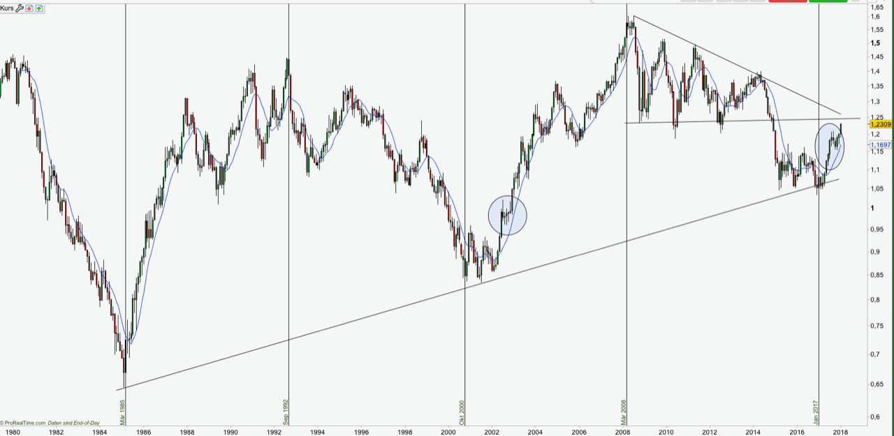 Zum Euro-Dollar-Zyklus: Das Währungspaar Euro/Dollar wechselt in Abständen von sieben bis neun Jahren die grundlegende Richtung. Demnach verzeichnete der Euro 1985, 2001 und wohl 2017 ein jeweils mehrjähriges Tief, von dem aus sich die Gemeinschaftswährung teils im Wert verdoppelte. Nimmt man das Tief von 1,04 Dollar im Jahr 2017 als Ausgangspunkt, erscheint ein Euro-Stand von 1,80 US-Dollar bis zum Jahr 2025 keinesfalls als abwegig.