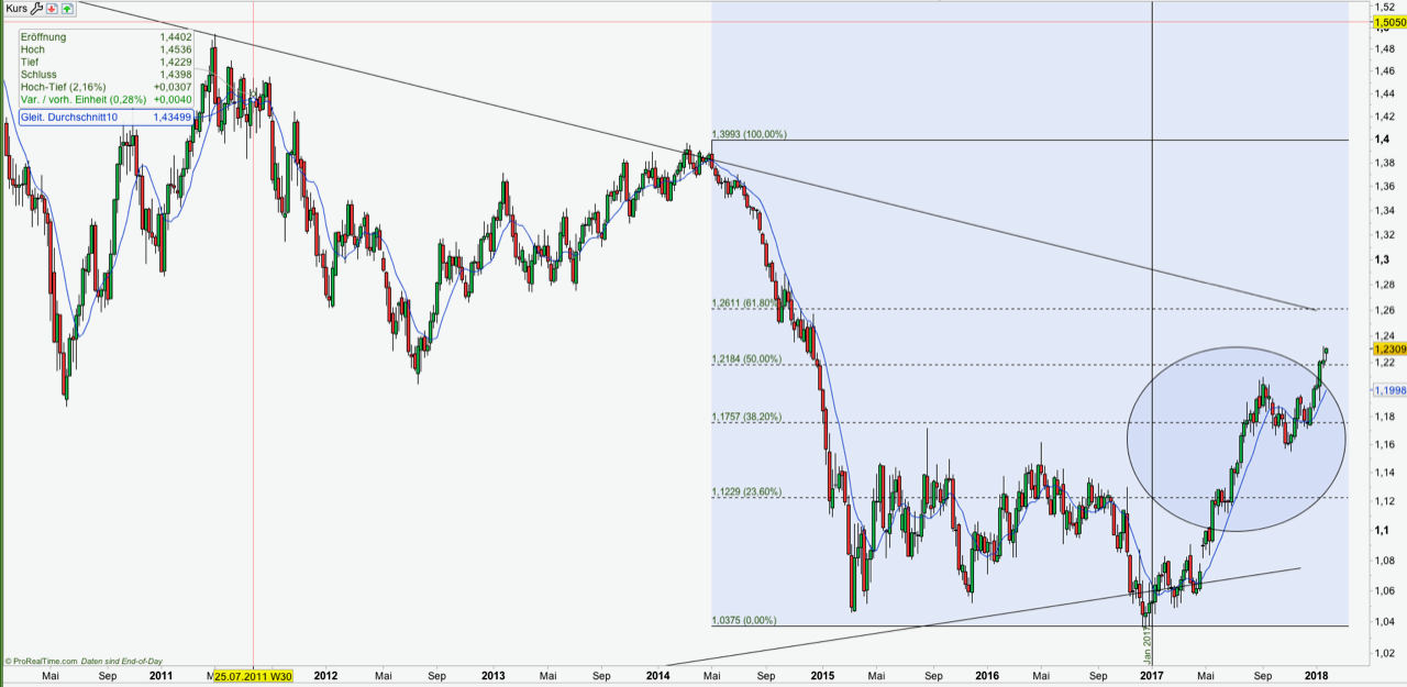 Die große Überraschung 2017 war der Euro: Die Gemeinschaftswährung legte auf 1,20 zu. Viele MArktbeobachter sind in ihren Prognosen umgeschwenkt und zeigen sich jetzt bullisch für den Euro. Wir meinen: Bis 2025 könnte der Euro auf 1,80 Dollar steigen. 2018 dürfte der Dollar allerdings erst mal ein Stück aufholen, sagt Stephan Albrech von der Albrech und Cie. Vermögensverwaltung.