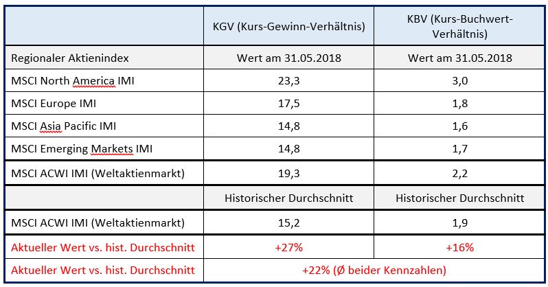 - Der Weltaktienmarkt gemessen am MSCI ACWI IMI Index wies Ende Mai 2018 ein KGV von 19,3 und ein Kurs-Buchwert-Verhältnis von 2,2 auf. Im Durchschnitt dieser beiden bekanntesten Bewertungskennzahlen ergab sich daraus eine Überbewertung von 22 Prozent relativ zum historischen Mittelwert (siehe Tabelle). Manche würden 22 Prozent als “moderat” umschreiben, andere vielleicht als “beträchtlich”, aber wohl niemand als “dramatisch”.