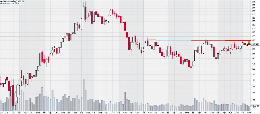 So schlägt die Stunde für Gold oft, wenn der Aktienmarkt Verluste verbucht. Keine schlechte Zeit also, um jetzt die Aussichten für Gold zu prüfen.Werfen wir zunächst einen Blick auf die Kursentwicklung des gelben Metalls. Chart 1 zeigt den Kurs des weltgrößten Indexfonds auf Gold (US-Kürzel: GLD) über zehn Jahre, wobei jede Kerze einen Monat darstellt. Klar zu erkennen ist, dass der Fonds seit 2014 um den Bereich von 130 Dollar auf Widerstand stößt, den er 2016 nicht überwinden konnte (rote Linie). Aktuell notiert er erneut knapp unterhalb dieser Zone. Ein nachhaltiger Ausbruch über die rote Linie wäre für den Goldpreis in Dollar sehr vorteilhaft und wird wohl von vielen Goldfans erhofft.