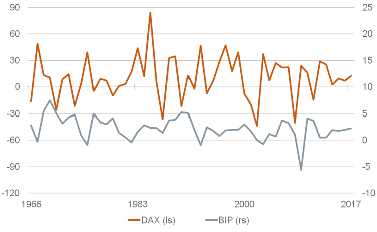 Ist das ein Gegenargument zu der Theorie? Ist die Konjunktur doch nicht so wichtig? Nein. Denn es hängt allein mit den Besonderheiten der Dax-Entwicklung zusammen. In den vorigen 50 Jahren haben sich – was viele vergessen haben – die Verhältnisse an den Aktienmärkten grundlegend verändert. Das Auf und Ab der Kurse war früher sehr viel extremer. Die Schwankungen gingen in der Spitze von plus 84 Prozent (1985) bis minus 44 Prozent (2002). Das waren Gegebenheiten, wie wir sie heute nur noch aus manchen Schwellen- und Entwicklungsländern kennen.
