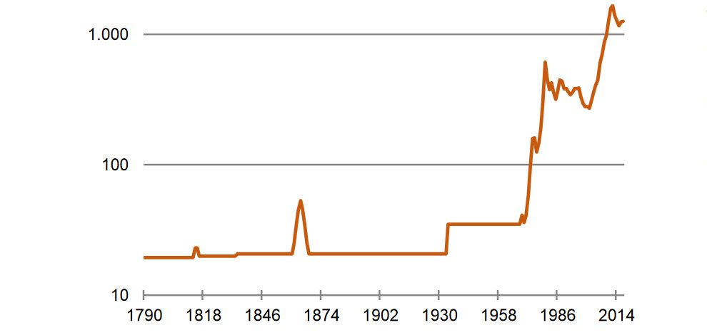 Wenn es so viele Gründe für einen sinkenden Goldpreis gibt, warum sollte man es trotzdem halten? Die Antwort: Sein Appeal ist nicht die kurzfristige Spekulation, sondern die langfristige, und zwar die ganz langfristige, Stabilität. Die Grafik zeigt den Goldpreis über die letzten mehr als 200 Jahre. Hier werden drei große Vorteile des Goldes als Anlagevehikel deutlich.