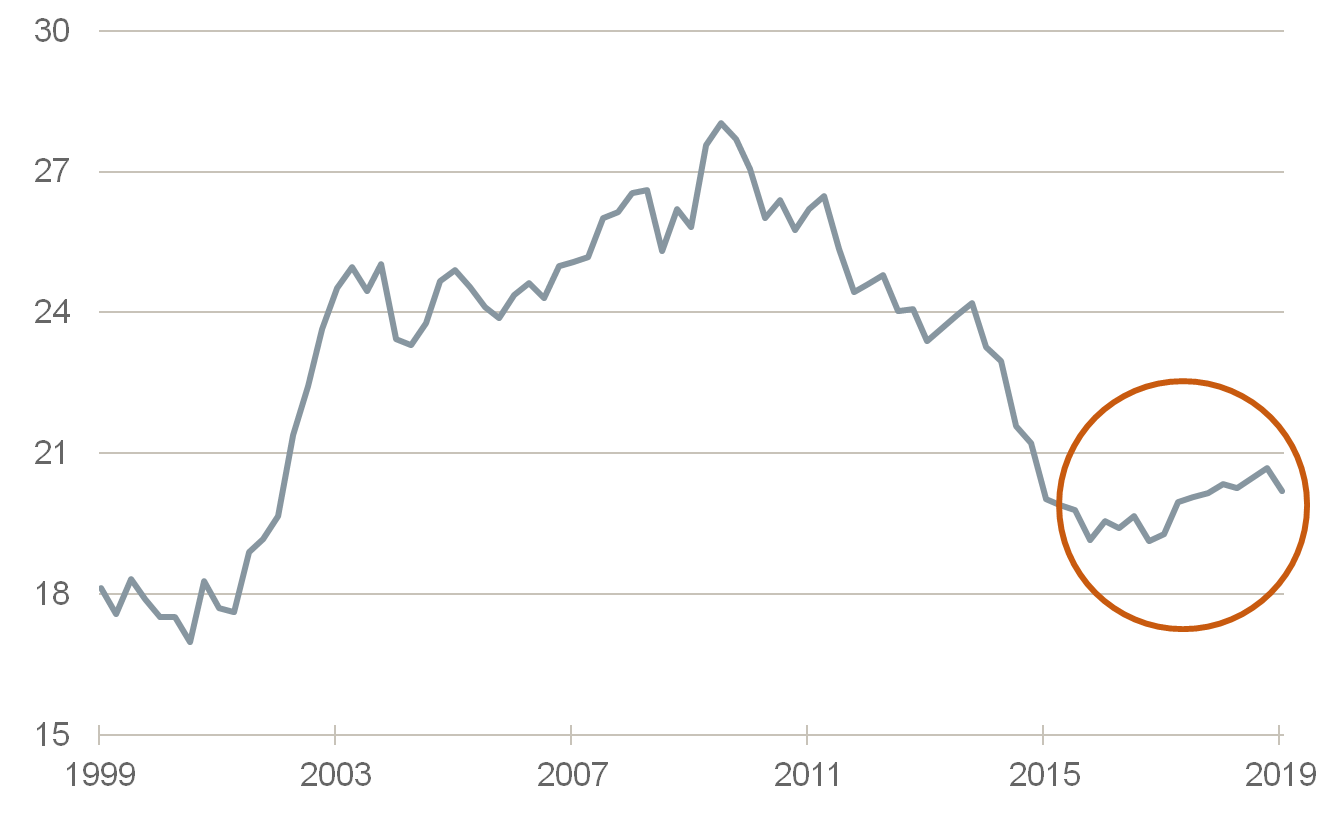 Das ist überraschend. Denn gesamtwirtschaftlich sieht es für die Gemeinschaftswährung gar nicht gut aus. Das Wachstum ist schwach, halb so groß wie das der USA. Die Inflation ist zu niedrig. Die Geldpolitik wird weiter gelockert. Bei negativen Zinsen von minus 0,4 % (und demnächst vielleicht noch weniger) ist eine Anlage in der Gemeinschaftswährung alles andere als attraktiv. Gegenüber dem US-Dollar hat sich der Euro in den letzten eineinhalb Jahren um 8 % abgewertet.