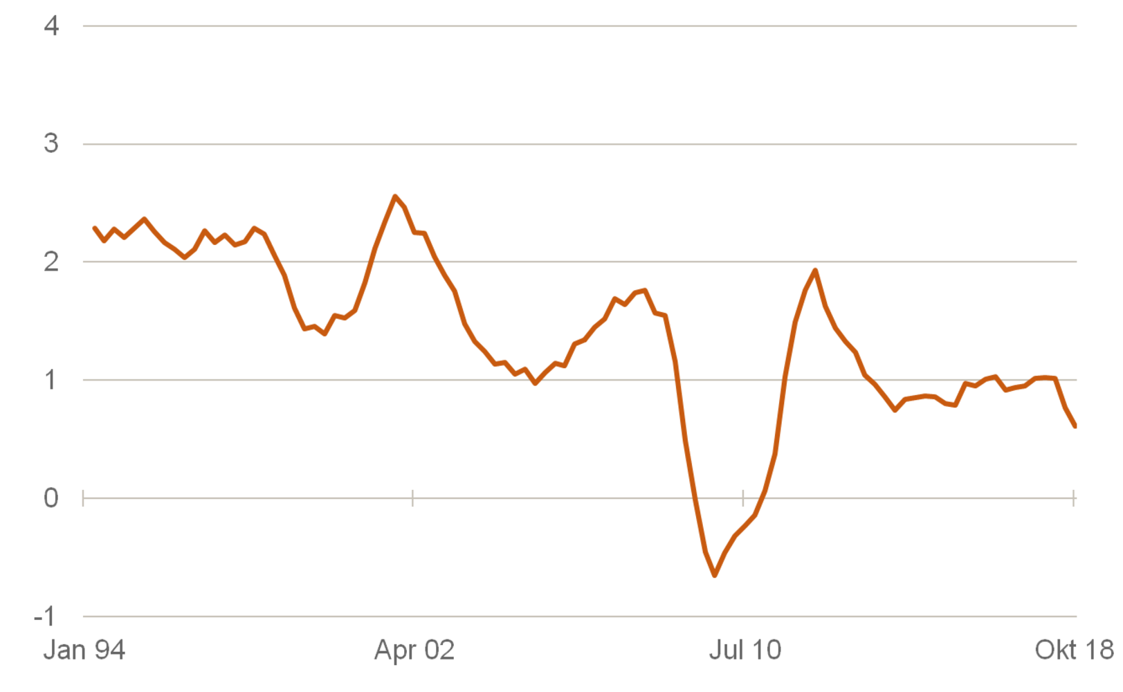 Das ist ein weltweites Phänomen. Es gilt sowohl für die USA, die durch ihr Silicon Valley zu einem Treiber der modernen Techniken geworden sind, wie auch für Deutschland, das noch hinterherhinkt. Die Grafik zeigt die Entwicklung der Produktivität je Arbeitsstunde in Deutschland in den letzten 25 Jahren. In den 90er Jahren lag die Zuwachsrate noch bei im Schnitt 2 % p. a. Inzwischen ist sie auf unter 1 % gefallen. 2018 ist sie gesunken.