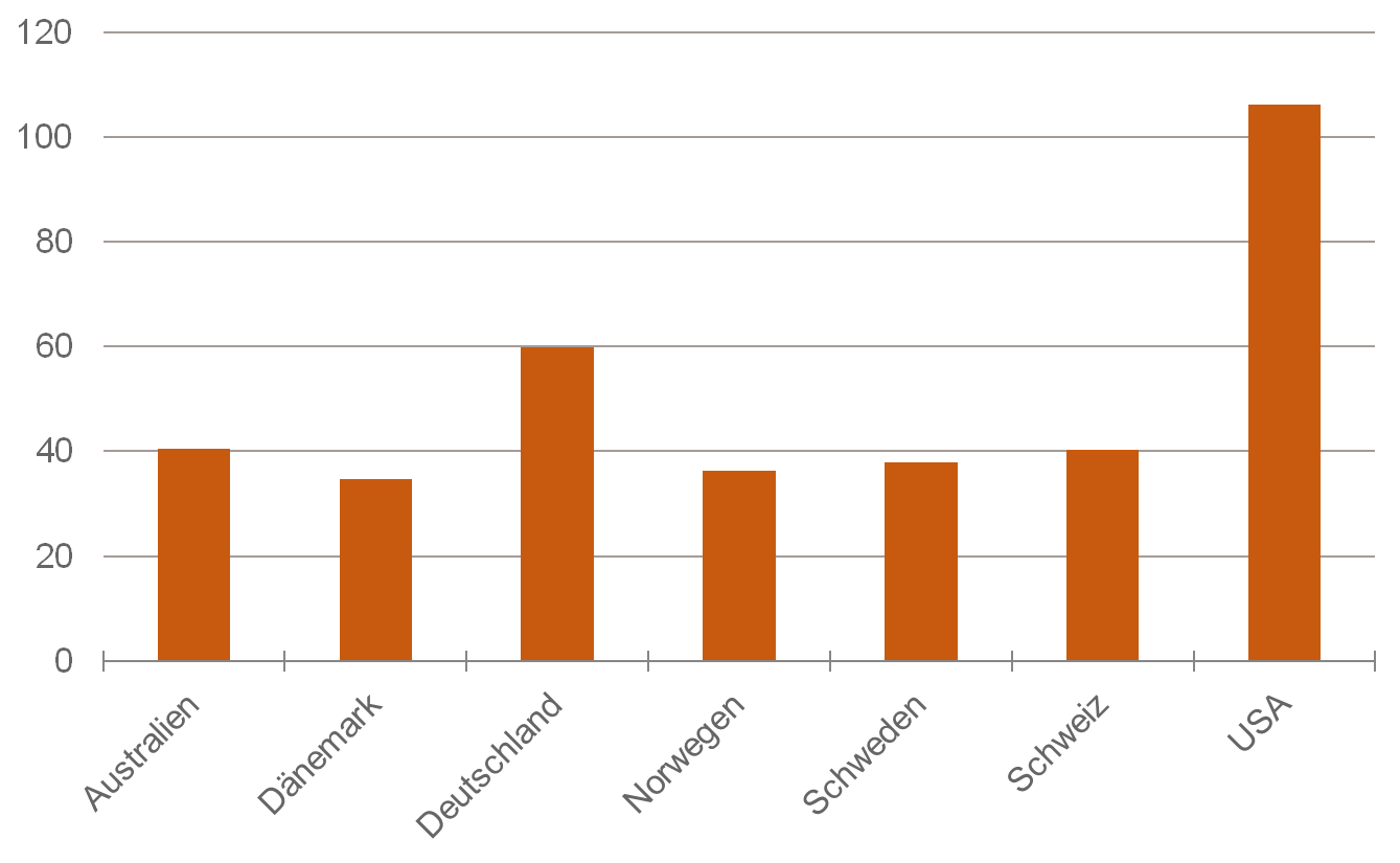 Bei den rein ökonomischen Faktoren ist die Sache nicht so unsicher. Hier gibt es Positives und Negatives. Wo die Vereinigten Staaten schlecht dastehen, ist die Bruttoverschuldung des Staates. Sie liegt jetzt bei über 100 % des BIPs. Das ist erheblich mehr als in anderen Staaten, die mit AAA bewertet werden (siehe Grafik). Erschwerend ist dabei, dass es in der US-Finanzpolitik derzeit kein Bewusstsein gibt, dass die Schulden zu hoch sind.
