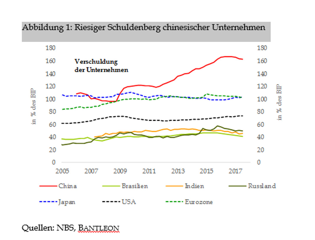 Zum anderen haben sich die Perspektiven für die Industrie und die Bauwirtschaft verschlechtert. Hier stellt vor allem die zunehmende Verschuldung der Unternehmen ein großes Problem dar. Die Verbindlichkeiten der Firmen betragen inzwischen mehr als 160 Prozent des BIPs. Das ist drei bis vier Mal so hoch wie in anderen großen aufstrebenden Volkswirtschaften – zum Beispiel Indien, Brasilien und Russland – und immerhin mehr als doppelt so hoch wie in den USA.