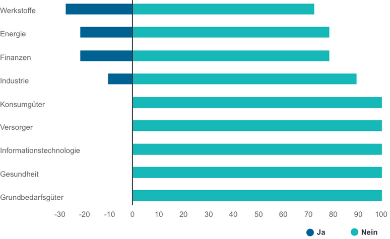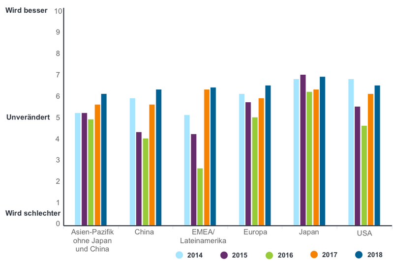 Der Blick auf die einzelnen Branchen zeigt ein durchweg positives Bild: Die Mehrzahl der Branchen sieht keinen Anlass zur Sorge, 100 Prozent der Unternehmen aus Informationstechnologie, Gesundheit und Konsum sehen genauso wie die Versorger keinen Anlass für eine Abkühlung der Stimmung. Gerade einmal in vier von neun Bereichen machen sich überhaupt Unternehmen um die wirtschaftliche Perspektive in China Gedanken, und dort liegt der Anteil maximal bei etwas mehr als 20 Prozent. Entsprechend blickt auch in diesen Branchen die große Mehrheit der Unternehmen entspannt auf Chinas zukünftige wirtschaftliche Entwicklung.