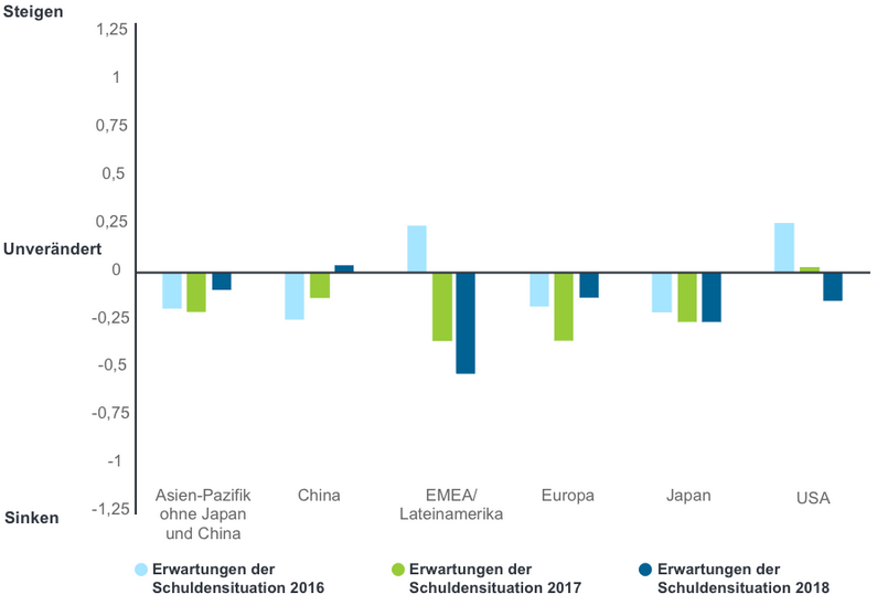 Ein Drittel der Analysten erwartet, dass die Verschuldung der chinesischen Unternehmen steigen wird, mehr als in jedem anderen Land. Gleichzeitig erwarten 62 Prozent der Analysten in China steigende Finanzierungskosten, deutlich mehr als zum Beispiel in den USA. Dennoch bereitet diese Entwicklung Beobachtern bislang keine Sorge. Der Grund: Die Rohstoffpreise sind im vergangenen Jahr erstmals seit Langem wieder gestiegen und haben damit eine deflationäre Phase beendet. Für China als weltgrößter Produzent vieler Industrierohstoffe wie Kupfer, Eisen und Aluminium ist das eine wichtige, positive Entwicklung. Zudem hat die Regierung die Jahre niedriger Preise für strukturelle Reformen genutzt und Überkapazitäten in bedeutenden Branchen wie etwa der Stahlindustrie abgebaut.