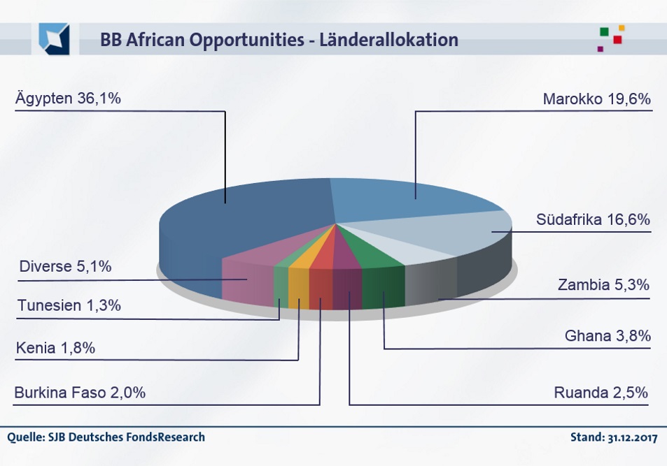 Im BB African Opportunities liegt Ägypten mit einem Anteil von 36,1 Prozent des FondsVermögens in der Länderallokation klar vorn. Auf dem zweiten Platz findet sich Marokko mit 19,6 Prozent des FondsVolumens. Platz drei in der geographischen Aufteilung des Bellevue-Fonds belegt Südafrika mit 16,6 Prozent – eine geringe Gewichtung im Vergleich mit anderen Afrikafonds. 5,3 Prozent des FondsVermögens sind in Zambia investiert, Ghana ist mit 3,8 Prozent innerhalb des Portfolios gewichtet. Es folgen weitere afrikanische Länder wie Ruanda (2,5 Prozent), Burkina Faso (2,0 Prozent) sowie Kenia (1,8 Prozent). Das FondsPortfolio wird durch eine Position in Tunesien (1,3 Prozent) abgerundet, sonstige afrikanische Länder repräsentieren 5,1 Prozent der FondsBestände.