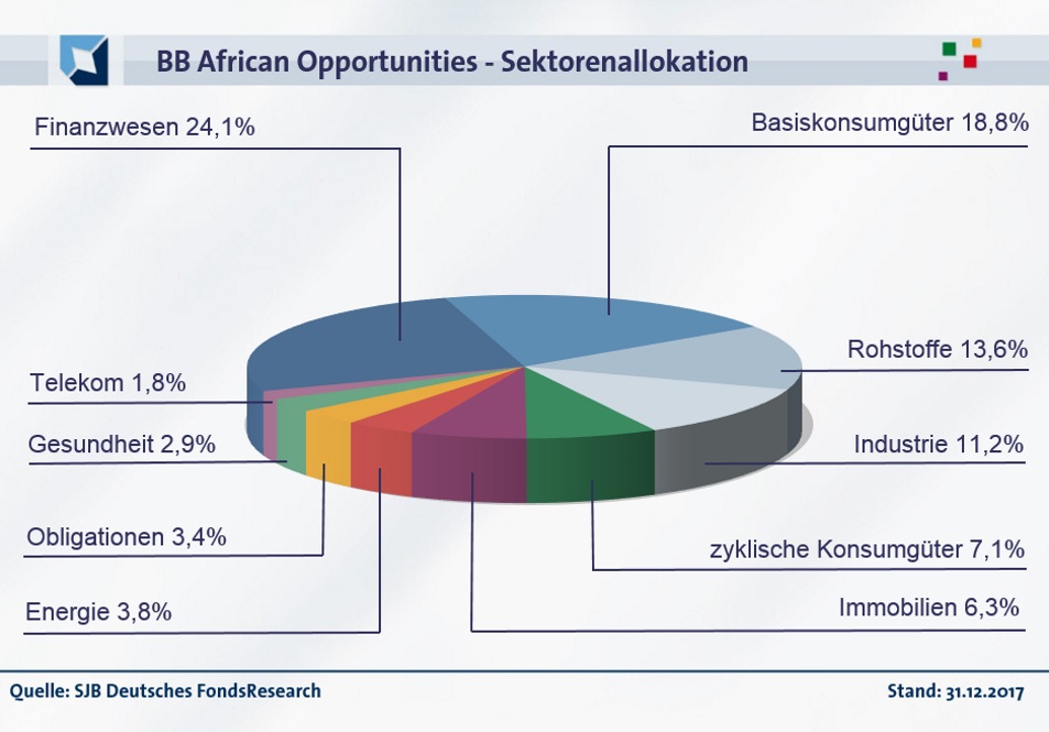 In der Sektorenallokation des Afrikafonds liegen Finanztitel mit 24,1 Prozent des FondsVermögens auf Platz eins. Platz zwei der wichtigsten Branchen des Bellevue-Produktes nimmt der Sektor der Basiskonsumgüter mit 18,8 Prozent Portfolioanteil ein. Im Bereich der Rohstoffwerte hat FondsManager Bou-Diab 13,6 Prozent des FondsVermögens investiert, Industrietitel sind mit 11,2 Prozent gewichtet. Unternehmen aus dem Sektor der zyklischen Konsumgüter decken 7,1 Prozent des FondsVolumens ab, Immobilienaktien besitzen einen Anteil von 6,3 Prozent am Portfolio. Energietitel (3,8 Prozent), Obligationen (3,4 Prozent) sowie Aktien aus dem Gesundheitswesen (2,9 Prozent) komplettieren die Branchenstruktur des Afrikaproduktes. Auf dem letzten Platz der Sektoren-Top 10 liegen Telekommunikationsdienstleister mit 1,8 Prozent. Per Ende Dezember 2017 beträgt die Liquiditätsquote des Fonds 6,0 Prozent.