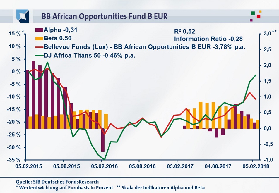 Über drei Jahre wartet der BB African Opportunities mit einer Wertentwicklung von -10,93 Prozent in Euro auf (Stichtag 05.02.2018). Besser steht der Dow Jones Africa Titans 50 Index da, der im selben Zeitraum ein Minus von lediglich -1,37 Prozent auf Eurobasis verzeichnet. Die Zahlen entsprechen einer Rendite p.a. von -3,78 Prozent beim Fonds bzw. einer Jahresrendite von -0,46 Prozent bei der Benchmark. Der Renditevorsprung des Dow Jones-Referenzindex bleibt auch im kurzfristigen Zeithorizont erhalten: Einer positiven Performance des Bellevue-Produktes von +7,46 Prozent für ein Jahr auf Eurobasis steht eine Wertentwicklung von +21,15 Prozent beim Africa Titans 50 Index gegenüber. Kurz- wie mittelfristig vermag der aktiv gemanagte Afrikafonds seine historische Mehrrendite gegenüber der passiven Benchmark nicht zu wiederholen – die seit FondsAuflage zu verzeichnende Outperformance bleibt davon jedoch unberührt!