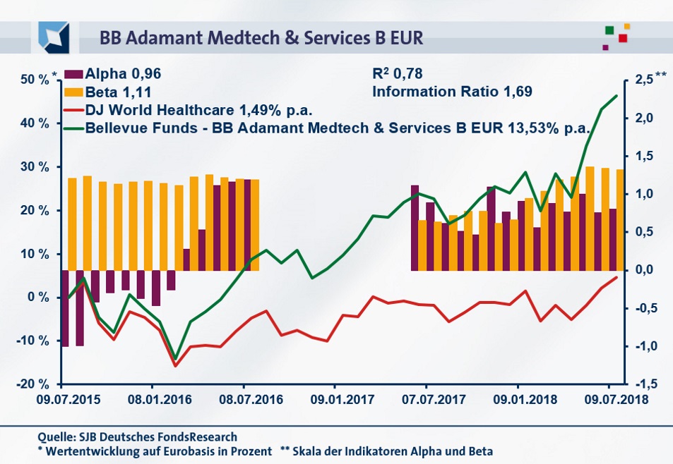 Über drei Jahre wartet der BB Adamant Medtech & Services mit einer Wertentwicklung von +46,40 Prozent in Euro auf (Stichtag 09.07.2018) – eine überzeugende Performance, die erheblich oberhalb der Marktrendite liegt. Der SJB-Vergleichsindex Dow Jones World Healthcare hat im selben Zeitraum ein Plus von lediglich +4,55 Prozent auf Eurobasis erzielt. Die Werte entsprechen einer Rendite von +13,53 Prozent p.a. in Euro bei dem Bellevue-Fonds und einer Jahresrendite von +1,49 Prozent bei der Benchmark. Im kurzfristigen Zeithorizont ist gleichfalls ein attraktiver Renditevorsprung des Medizintechnik-Fonds gegenüber dem Dow Jones World Healthcare Index zu verzeichnen: Einer Wertentwicklung des BB Adamant Medtech & Services von +19,25 Prozent für ein Jahr steht eine Rendite von +6,63 Prozent beim SJB-Referenzindex gegenüber. Das beachtliche Performanceplus in zweistelliger Höhe macht den Bellevue-Fonds zum klaren Sieger im Wettbewerb mit dem weltweiten Medizintechniksektor – welche Folgen hat dies für die Alpha-Analyse?