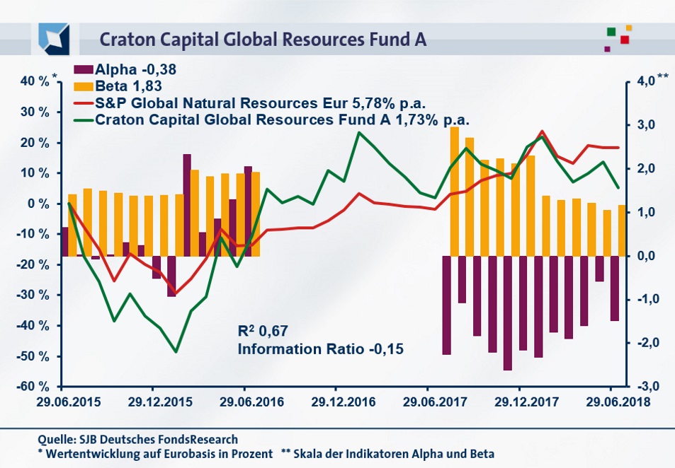 Per 29. Juni 2018 hat der Craton Capital Global Resources Fund über drei Jahre eine kumulierte Wertentwicklung von +5,29 Prozent in Euro aufzuweisen. Dies entspricht einer Rendite von +1,73 Prozent p.a. Obwohl sich die Wertentwicklung im grünen Bereich befindet, wird sie von der des SJB-Vergleichsindex noch übertroffen: Der S&P Global Natural Resources Index (EUR) hat im selben Zeitraum eine Gesamtperformance von +18,38 Prozent bzw. eine Jahresrendite von +5,78 Prozent auf Eurobasis zu verzeichnen. Beim Wechsel auf den kurzfristigen Betrachtungshorizont stellt sich das Szenario ähnlich dar: Über ein Jahr verzeichnet der Craton-Fonds eine Performance von +3,27 Prozent in Euro und fällt damit hinter den globalen S&P-Rohstoffindex zurück, der mit einem deutlich höheren Plus von +20,44 Prozent aufwartet. In den hier analysierten Zeitspannen bleibt eine Mehrrendite durch das aktive Titelmanagement von FondsManager Bachmann aus – aber gerade dadurch ergibt sich ein hohes antizyklisches Aufholpotenzial für den Fonds. Durch die zwar positive, doch im Marktvergleich unterdurchschnittliche Wertentwicklung erreicht das Craton-Produkt nur Platz zwei im Renditevergleich – wie wirkt sich dies auf die Alpha-Werte aus?
