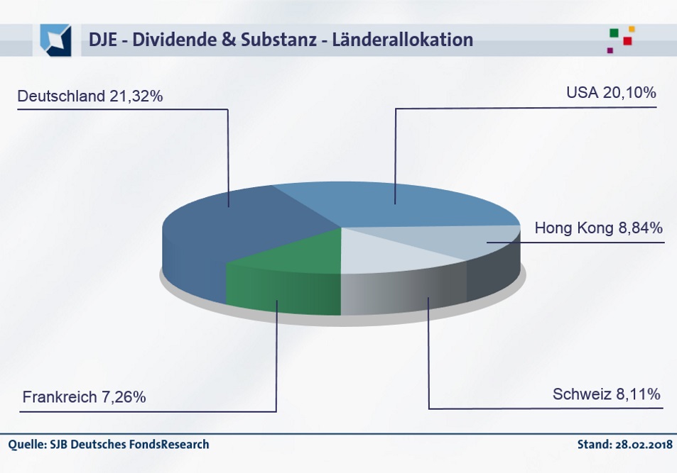 Die größte Länderposition im Portfolio des DJE – Dividende & Substanz stellen Aktien aus Deutschland dar, die 21,32 Prozent des FondsVermögens ausmachen. Ähnlich hoch gewichtet ist FondsManager Ehrhardt in den USA, wo 20,10 Prozent der FondsBestände investiert sind. Substanzstarke Aktien aus Hong Kong machen 8,84 Prozent im FondsPortfolio aus, während 8,11 Prozent des FondsVolumens der Schweiz entstammen. Frankreich steuert 7,26 Prozent zum Gesamtbestand an Aktien mit hoher Dividendenrendite bei, sonstige Länder repräsentieren per Ende Juli 25,31 Prozent des FondsVermögens.