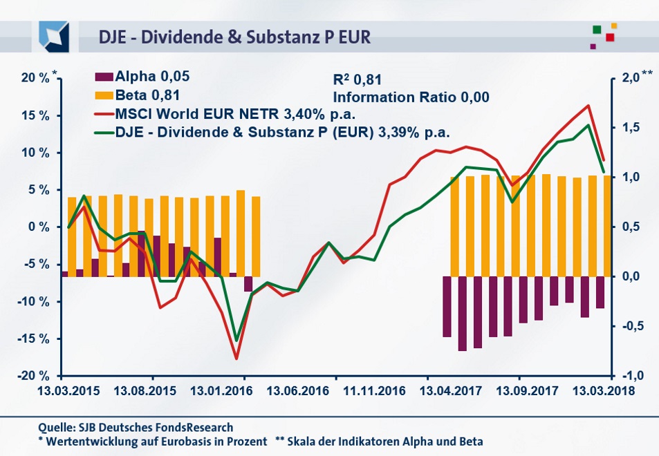 Über drei Jahre wartet der DJE – Dividende & Substanz mit einer Wertentwicklung von +10,51 Prozent auf Eurobasis auf (Stichtag 13.03.2018). Minimal besser schnitt der MSCI World EUR NETR als SJB-Vergleichsindex ab – das Kursbarometer für den globalen Aktienmarkt hat im selben Zeitraum ein Plus von +10,58 Prozent in Euro generiert. Die Zahlen entsprechen einer Rendite von +3,39 Prozent p.a. beim Fonds gegenüber einer Jahresrendite von +3,40 Prozent bei der Benchmark. Im kurzfristigen Zeithorizont liegt der DJE-Fonds mit seiner Dividendenstrategie vorn: Einer Wertentwicklung von +6,06 Prozent für ein Jahr steht eine Rendite von +0,20 Prozent beim MSCI-Referenzindex gegenüber. Kurzfristig schlagen die von Marktexperte Ehrhardt ausgewählten Value-Aktien den breiten Markt, längerfristig ergibt sich eine fast identische Performance. Wie schlägt sich dies in der Alpha-Analyse nieder?
