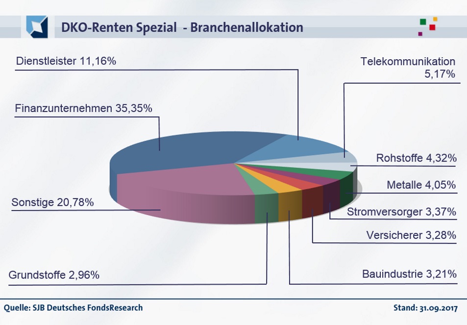 Der DKO-Renten Spezial hat die Währungsstruktur seines Portfolios klar auf den Euro ausgerichtet: 98,65 Prozent der im Fonds befindlichen Anleihentitel sind in Euro notiert, Unternehmensanleihen in US-Dollar dienen mit einem Anteil von 1,31 Prozent lediglich als Beimischung. Abgerundet wird die Währungsallokation des Fonds durch Wertpapiere in Schweizer Franken mit 0,03 Prozent. In der Sektorengewichtung des DKO-Renten Spezial befinden sich Anleihen von Finanzunternehmen mit 35,35 Prozent Portfolioanteil auf dem ersten Platz. Auf Platz zwei der Branchenallokation liegen Dienstleistungsunternehmen, die 11,16 Prozent des FondsVolumens einnehmen, Platz drei in der Branchenstruktur geht an Telekommunikationstitel mit 5,17 Prozent. Durchschnittlich stark gewichtet innerhalb des Anleihenportfolios aus „Corporate Bonds“ sind der Rohstoffsektor mit 4,32 Prozent sowie die metallverarbeitende Industrie mit 4,05 Prozent Anteil am FondsVolumen. Unternehmensanleihen von Stromversorgern nehmen 3,37 Prozent des FondsVermögens ein, Versicherer decken 3,28 Prozent der FondsBestände ab. Komplettiert wird der Branchenmix des DKO-Fonds durch Baufirmen (3,21 Prozent) sowie die Grundstoffindustrie (2,96 Prozent). Per Ende September nehmen übrige Sektoren 20,78 Prozent des FondsVolumens ein, die Liquiditätsquote des Fonds liegt bei 6,35 Prozent. Unter den Top-10-Positionen befinden sich Anleihen des spanischen Bauunternehmens Obrascon Huarte, des französischen Stahlrohrproduzenten Vallourec oder des US-Datendienstleisters Veritas.
