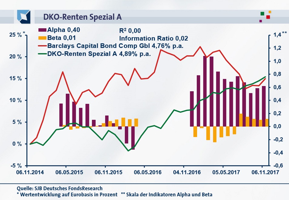 Per 26. Oktober 2017 hat der DKO-Renten Spezial über drei Jahre eine kumulierte Wertentwicklung von +15,43 Prozent in Euro erwirtschaftet, was einer Rendite von +4,89 Prozent p.a. entspricht. Eine attraktive Wertentwicklung in der jüngsten Niedrigzinsphase, die das Renditepotenzial globaler Unternehmensanleihen realisiert! Der Vergleichsindex Barclays Capital Bond Composite Global entwickelt sich schwächer: Die von der SJB gewählte Benchmark legte im selben Zeitraum um +14,98 Prozentpunkte auf Eurobasis zu, was einem Ergebnis von +4,76 Prozent p.a. entspricht. Beim Wechsel auf die Jahresbetrachtung weitet sich der Performancevorsprung des aktiv gemanagten Rentenfonds nochmals aus: Während der Fonds aus dem Hause Dr. Kohlhase ein Ergebnis von +7,17 Prozent in Euro verzeichnet, weist die passive Benchmark mit -4,11 Prozent eine negative Rendite auf. Kurzfristig liegt der DKO-Fonds deutlich vorn, auch mittelfristig kommt es zu einer Outperformance. Wie schlägt sich dies in der Alpha-Analyse nieder?