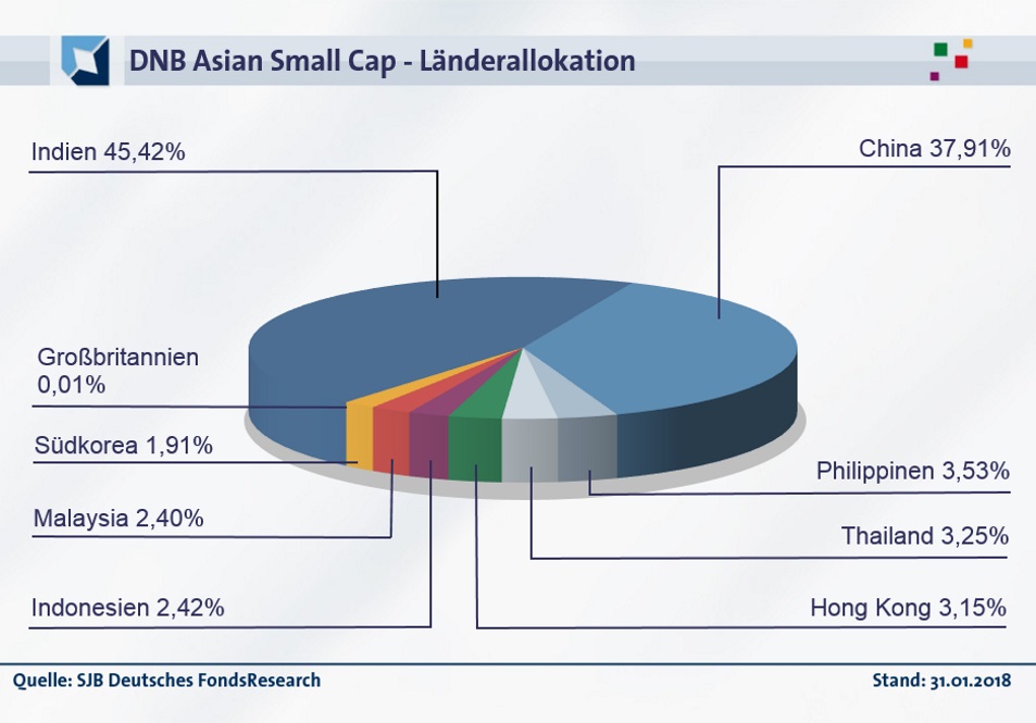 Auf Platz eins der Länderallokation des DNB Asian Small Cap befindet sich Indien mit 45,42 Prozent Portfolioanteil. Der zweite geographische Schwerpunkt des Nebenwerte-Fonds liegt im „Reich der Mitte“, wo 37,91 Prozent des FondsVermögens in der Volksrepublik China investiert sind. Alle anderen asiatischen Schwellenländer kommen auf FondsEbene nicht über den Charakter einer Beimischung hinaus: Den dritten Platz in der Ländergewichtung belegen die Philippinen, wo 3,53 Prozent des FondsVolumens investiert sind. Dahinter folgt Thailand mit 3,25 Prozent, Aktien aus Hong Kong machen 3,15 Prozent der FondsBestände aus. In Indonesien sind 2,42 Prozent der Anlegergelder investiert, Malaysia bringt es auf einen Anteil von 2,11 Prozent am FondsVolumen. Eine kleinere Position in Südkorea (1,91 Prozent) sowie ein Mini-Bestand in Großbritannien (0,01 Prozent) runden die geographische Zusammensetzung des Fonds ab.