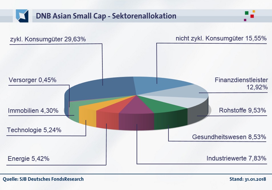 In der Branchenallokation des DNB Asian Small Cap liegen Unternehmen aus dem Sektor der zyklischen Konsumgüter mit 29,6 Prozent Portfolioanteil vorn. Den zweiten Platz in der Branchenstruktur nehmen nicht zyklische Verbrauchsgüter mit 15,55 Prozent des FondsVermögens ein. Finanzdienstleister sind im Portfolio des Asien-Fonds mit 12,92 Prozent gewichtet, Rohstoffwerte decken 9,53 Prozent vom FondsVolumen ab. Gesundheitstitel repräsentieren 8,53 Prozent des Portfolios, Industriewerte sind in dem DNB-Produkt mit 7,83 Prozent vertreten. Energieaktien liegen mit 5,42 Prozent des FondsVermögens im unteren Bereich der Sektorenallokation, auch Technologietitel sind mit 5,24 Prozent nur unterdurchschnittlich präsent. Immobilienaktien (4,30 Prozent) sowie Telekommunikationswerte (0,60 Prozent) runden das Nebenwerte-Portfolio des DNB-Fonds ab.