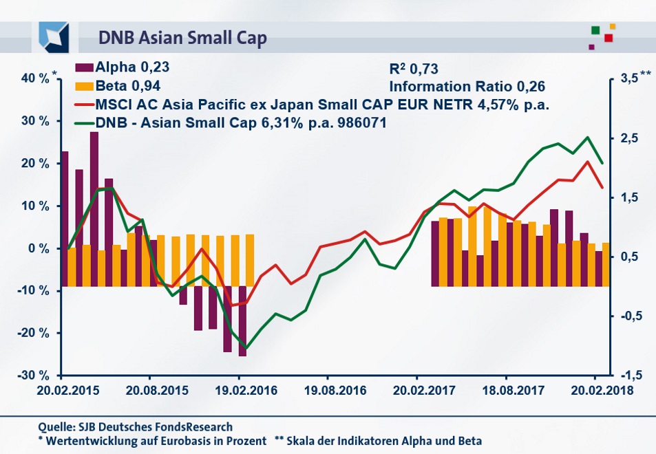 Über drei Jahre hat der DNB Asian Small Cap eine kumulierte Wertentwicklung von +20,16 Prozent in Euro und damit eine Rendite von +6,31 Prozent p.a. aufzuweisen (Stand 20.02.2018). Der MSCI AC Asia Pacific ex Japan Small Cap EUR NETR als von der SJB ausgewählter Vergleichsindex wird klar übertroffen: Dieser hat im letzten Dreijahreszeitraum eine Gesamtrendite von +12,44 Prozent in Euro erwirtschaftet, was einem Ergebnis von +3,98 Prozent p.a. entspricht. Der Renditevorsprung von knapp acht Prozentpunkten ist eine reife Leistung, und auch auf Jahressicht kann der DNB-Fonds seinen ersten Platz im Performancewettstreit behaupten: Über ein Jahr fällt die Wertentwicklung des Asien-Fonds mit +11,87 Prozent in Euro deutlich besser als die des MSCI-Referenzindex aus, der es auf ein Plus von +5,87 Prozent bringt. Die in beiden Zeithorizonten erzielte attraktive Mehrrendite macht DNB-FondsManager Thepade zum Gesamtsieger im Performancevergleich mit der Benchmark – das nach Bottom-up-Kriterien zusammengestellte FondsPortfolio demonstriert sowohl kurz- wie mittelfristig seine Stärken.