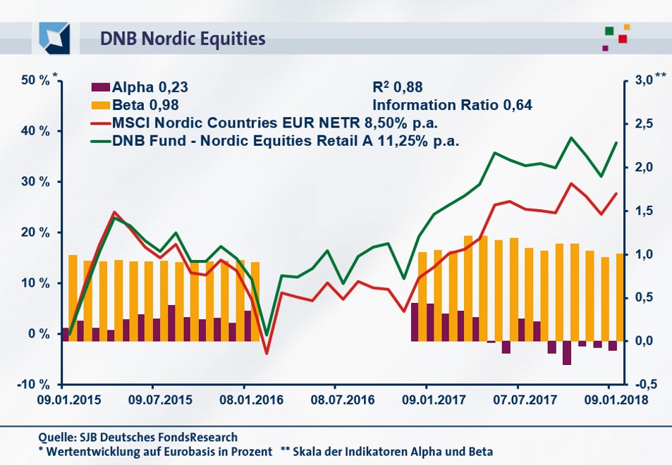 Per 9. Januar 2018 hat der DNB Nordic Equities Fund über drei Jahre eine kumulierte Wertentwicklung von +37,74 Prozent in Euro erwirtschaftet, was einer Rendite von +11,25 Prozent p.a. entspricht. Mit diesem attraktiven Performanceergebnis übertrifft der Fonds die von der SJB gewählte Benchmark um fast zehn Prozentpunkte: Denn der MSCI Nordic Countries EUR NETR verzeichnet über drei Jahre eine Wertentwicklung von +27,76 Prozent auf Eurobasis bzw. ein jährliches Ergebnis von +8,50 Prozent. Beim Wechsel auf den kurzfristigen Zeithorizont liegt der skandinavische Aktienfonds knapp hinter dem nordischen Referenzindex: Über ein Jahr generiert FondsManager Hjørnevik mit seinem Portfolio eine Performance von +11,43 Prozent in Euro, während der MSCI-Index mit einer Rendite von +12,80 Prozent aufwarten kann. Die längerfristig erzielte hohe Mehrrendite macht den DNB Nordic Equities zum klaren Gewinner im Performancewettstreit mit der Benchmark. Bestätigen die Alpha-Werte dieses positive Szenario?