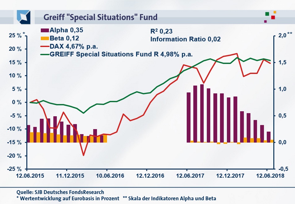 Per 14. Juni 2018 hat der Greiff “Special Situations” Fund über drei Jahre eine kumulierte Wertentwicklung von +15,71 Prozent in Euro aufzuweisen, was einer Rendite von +4,98 Prozent p.a. entspricht. Dies ist eine noch bessere Performance als beim DAX, dem von der SJB ausgewählten Vergleichsindex: Das Kursbarometer für den deutschen Aktienmarkt wartet mit einer Gesamtrendite von +14,70 Prozent in Euro bzw. einem Ergebnis von +4,67 Prozent jährlich auf. Auch beim Wechsel des Vergleichszeitraums auf ein Jahr erzielt der aktiv gemanagte Fonds mit seinem Fokus auf Firmen in Sondersituationen die höheren Renditen: Mit einer Wertentwicklung von +2,45 Prozent entwickelt sich der Greiff-Fonds besser als die SJB-Benchmark DAX, die um +1,20 Prozent zulegen konnte. In beiden Zeithorizonten generiert der Special Situations-Fund ein attraktives Performanceplus gegenüber dem deutschen Aktienmarkt – im Renditewettbewerb mit dem DAX ist das Investmentprodukt somit der klare Sieger.