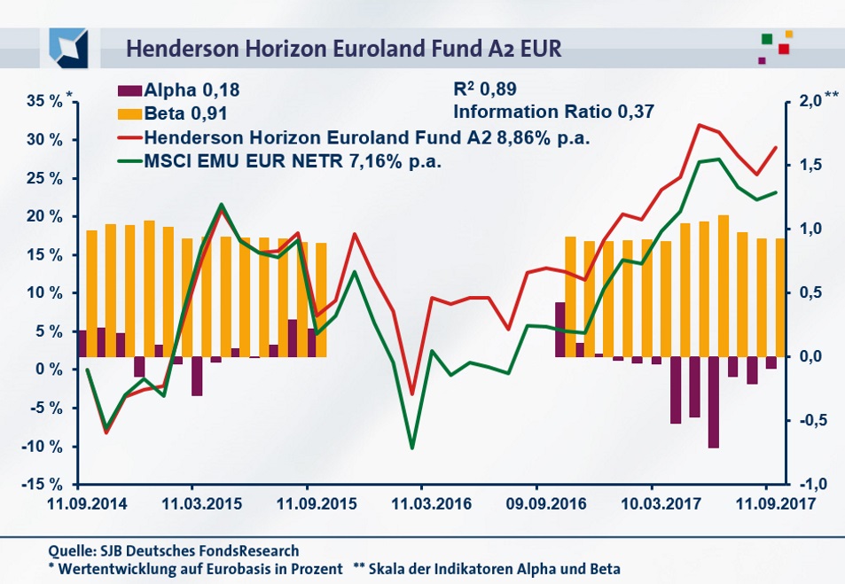 Per 11. September 2017 hat der Henderson Horizon Euroland Fund über drei Jahre eine kumulierte Wertentwicklung von +29,04 Prozent in Euro zu verzeichnen. Eine attraktive Performance für den europäischen Aktienfonds, die einer Rendite von +8,86 Prozent p.a. entspricht. Der MSCI EMU EUR NETR als die vom Fonds genutzte Benchmark kann hier nicht mithalten: Der Index legte im selben Zeitraum um +23,09 Prozentpunkte auf Eurobasis zu, was einem Ergebnis von +7,16 Prozent p.a. gleichkommt. Beim Wechsel auf die Jahresbetrachtung büßt der Henderson-Investmentfonds seinen Performancevorsprung ein: Während das aktiv gemanagte Produkt ein Ergebnis von +13,96 Prozent in Euro verzeichnet, kann sich die passive Benchmark mit einer Wertentwicklung von +16,53 Prozent auf den ersten Platz schieben. Da die längerfristige Mehrrendite stärker zu gewichten ist und mit sechs Prozentpunkten auch deutlicher ausfällt, ist der Euroland-Fonds der Gesamtsieger im Performancevergleich. Was trägt die Alpha-Analyse zur FondsBewertung bei?
