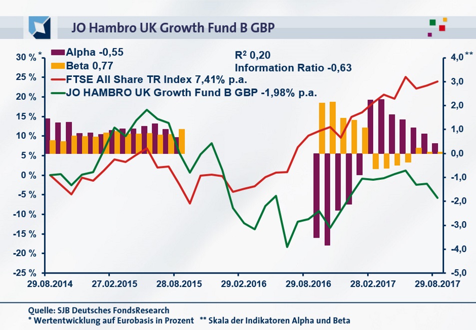 Per 29. August 2017 hat der JO Hambro UK Growth Fund über drei Jahre eine kumulierte Wertentwicklung von -5,84 Prozent in Euro aufzuweisen – dies entspricht einer Rendite von -1,98 Prozent p.a. Aufgrund der für das britische Pfund ungünstigen Währungsentwicklung verkehrt sich die in GBP positive FondsPerformance auf Eurobasis ins Minus. Besser sieht es bei der Benchmark FTSE All-Share TR Index aus: Der von der SJB gewählte Vergleichsindex verzeichnet über drei Jahre eine Euro-Gesamtrendite von +23,95 Prozent bzw. ein Ergebnis von +7,41 Prozent p.a. Beim Wechsel auf die Jahresbetrachtung gelingt es JO Hambro-FondsManager Costar, mit seiner Performance in den positiven Bereich vorzudringen: Mit einer Wertentwicklung von +6,01 Prozent fallen die Kursgewinne trotzdem geringer als diejenigen der Benchmark aus (FTSE All-Share TR Index: +12,62 Prozent).