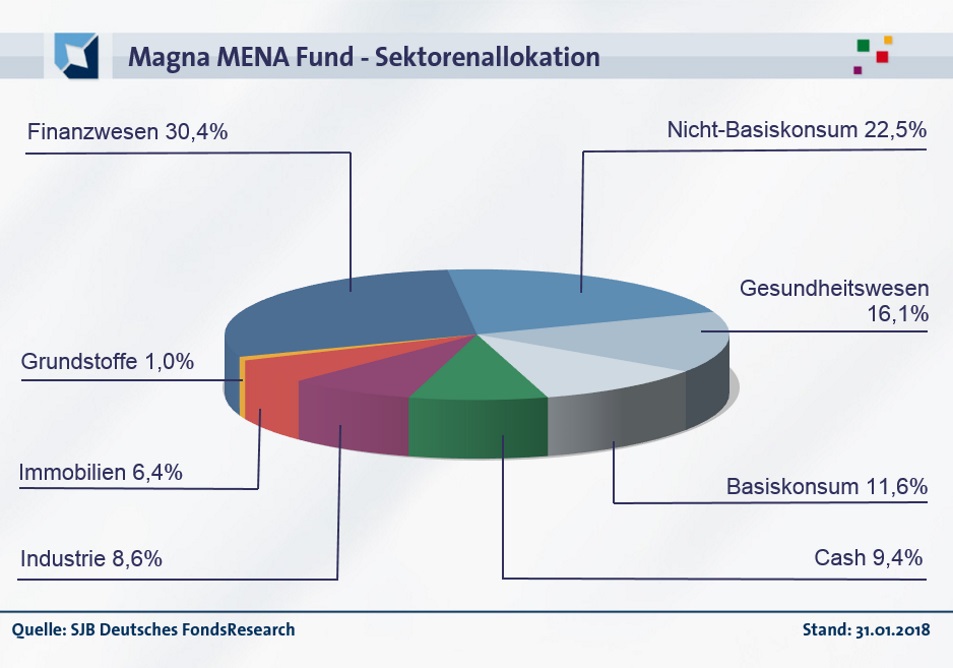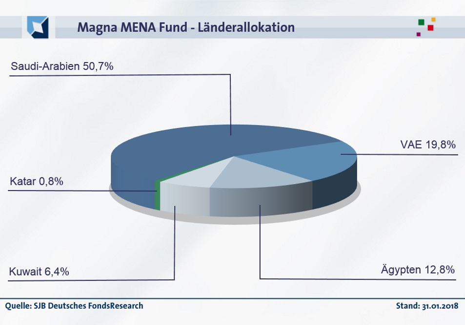 In der Länderallokation des Magna MENA Fund liegt Saudi-Arabien mit 50,7 Prozent Portfolioanteil vorn – mehr als die Hälfte des FondsVermögens sind hier investiert. Deutlich dahinter folgen die Vereinigten Arabischen Emirate (VAE), wo 19,8 Prozent des FondsVolumens angelegt sind. Den dritten Platz in der Ländergewichtung belegt Ägypten mit 11,0 Prozent der FondsBestände. Kuwait bringt es auf einen Anteil von 6,4 Prozent am FondsVolumen, eine kleinere Position in Katar (0,8 Prozent) rundet die geographische Zusammensetzung des Fonds ab. Sonstige Frontier Markets repräsentieren 9,4 Prozent des FondsPortfolios. Die Cash-Quote liegt per Ende Januar ebenfalls bei 9,4 Prozent.