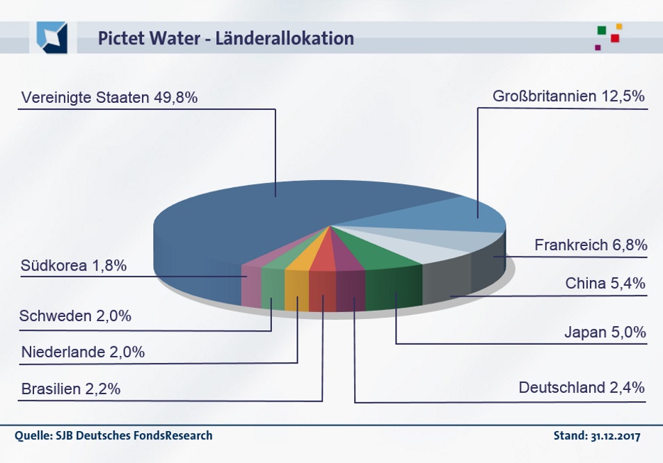In der Ländergewichtung des Pictet Water stellen die USA mit 49,8 Prozent Portfolioanteil den geographischen Schwerpunkt dar. Auf Platz zwei ist Großbritannien mit 12,5 Prozent zu finden, während 6,8 Prozent des FondsVolumens in Frankreich investiert sind. Im Mittelfeld der geographischen Aufteilung liegen mit China (5,4 Prozent) und Japan (5,9 Prozent) zwei asiatische Staaten. Deutschland (2,4 Prozent), Brasilien (2,2 Prozent) und die Niederlande (2,0 Prozent) finden sich im hinteren Teil der Länderallokation. 2,0 Prozent des FondsVermögens sind in Schweden beheimatet, Aktien aus Südkorea (1,8 Prozent) runden die geographische Struktur des Pictet-Fonds ab. Komplettiert wird die Portfoliostruktur durch Wasseraktien aus übrigen Staaten mit 8,6 Prozent.
