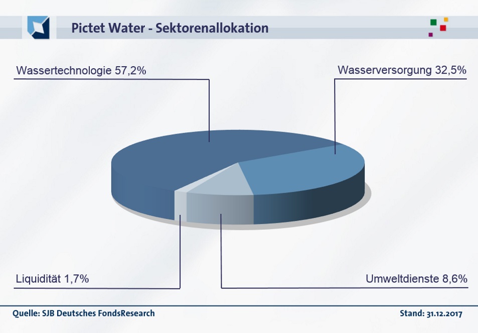In der Sektorengewichtung des Pictet Water sind Titel aus dem Bereich Wassertechnologie mit 57,2 Prozent am stärksten vertreten. Dahinter folgen Unternehmen der Wasserversorgung mit 32,5 Prozent, Umweltdienstleister machen 8,6 Prozent des Portfolios aus. Per Ende Dezember 2017 liegt die Liquiditätsquote des Fonds bei 1,7 Prozent. Welche Einzeltitel sind die aktuellen Favoriten von FondsManager Portner? Größte Einzelposition im Pictet Water ist das US-amerikanische Wasseraufbereitungsunternehmen Xylem, gefolgt von American Water Works und dem französischen Wasser- und Abwasserdienstleister Veolia Environnement. Überdurchschnittlich überzeugt ist Marktexperte Portner auch von dem US-Mischkonzern Danaher, der unter anderem Messgeräte für die Reinheitsbestimmung von Wasser herstellt, sowie dem Technologieunternehmen Thermo Fisher Scientific. Schwellenländerunternehmen wie die chinesische Beijing Enterprises Water sowie die brasilianische SABESP entwickelten sich hingegen zuletzt schwächer.