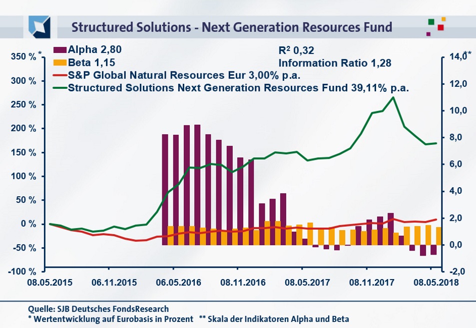 Per 8. Mai 2018 hat der Structured Solutions Next Generation Resources Fund eine kumulierte Wertentwicklung von +169,44 Prozent in Euro über drei Jahre aufzuweisen. Eine hervorragende Performanceleistung, die einer Rendite von +39,11 Prozent p.a. entspricht. Wie erfolgsträchtig die Spezialisierung auf Lithium-Aktien gerade in den letzten beiden Jahren gewesen ist, zeigt die Gegenüberstellung mit dem weltweiten Rohstoffsektor: Der S&P Global Natural Resources Index (EUR) als SJB-Benchmark hat im selben Zeitraum nur eine Gesamtperformance von +9,30 Prozent bzw. eine Jahresrendite von +3,00 Prozent auf Eurobasis zu verzeichnen. Beim Wechsel auf den kurzfristigen Betrachtungshorizont muss der von Commodity Capital gemanagte Fonds hingegen Platz eins abgeben: Über ein Jahr verzeichnet das Investmentprodukt eine Performance von +15,29 Prozent in Euro und wird vom globalen S&P Rohstoffindex übertroffen, der mit einem Plus von +21,30 Prozent aufwarten kann. Die attraktive Mehrrendite von über 160 Prozentpunkten über drei Jahre macht den aktiv gemanagten Lithium-Fonds trotzdem mit großem Vorsprung zur Nummer eins im Renditevergleich. Wie wirkt sich diese langfristig erheblich bessere Wertentwicklung auf die Alpha-Werte aus?