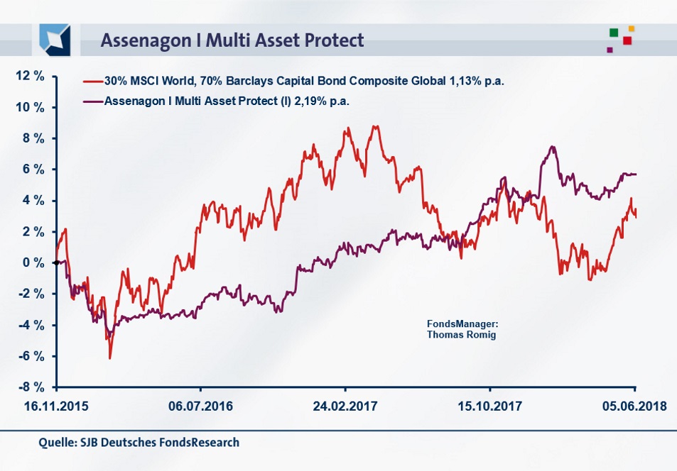 Die ausgewogene Portfoliostruktur des Assenagon I Multi Asset Protect ermöglicht Anlegern auch in der aktuellen Niedrigzinsphase attraktive Erträge bei gleichzeitigem Schutz des FondsVermögens in Krisenzeiten. Die Wertsicherungsstrategie sorgt für die konsequente Vermeidung größerer Verluste auch in turbulenten Börsenphasen, während die breite Mischung erfolgversprechender Investments aus verschiedensten Anlageklassen solide Renditen bei moderaten Schwankungen liefert. Ein defensiv ausgerichteter, sehr intelligent konzipierter Multi-Asset-Fonds, der sich vorzüglich als Grundbaustein eines konservativen FondsDepots eignet.