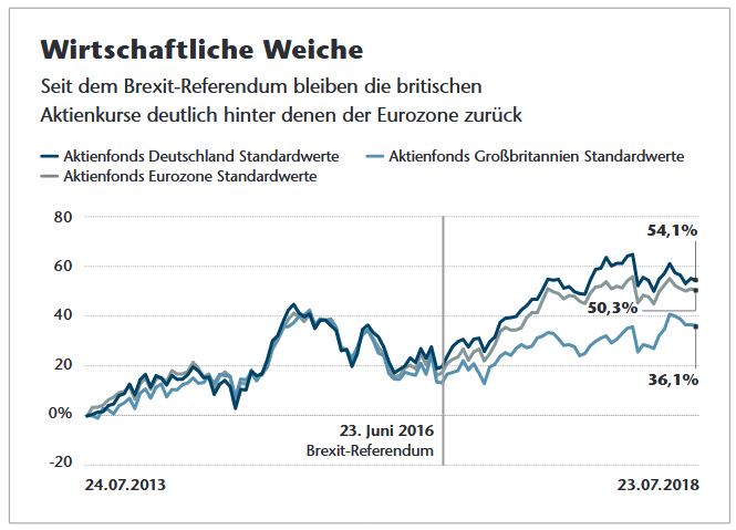 Den braucht es wohl auch, denn bislang wirkt das Referendum vom 23. Juni 2016 wie ein wirtschaftlicher Bremsklotz. Seitdem hinken die Aktienkurse der großen Konzerne auf der Insel ihren europäischen Wettbewerbern weit hinterher. Diese haben in den zwei Jahren mehr als doppelt so viel an Wert gewonnen.