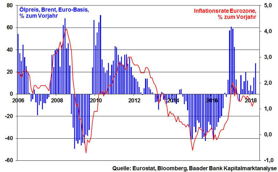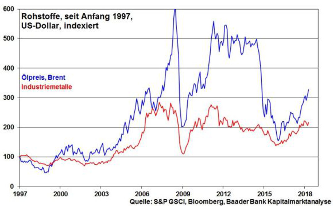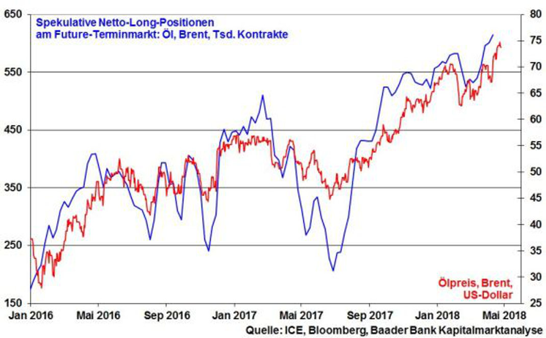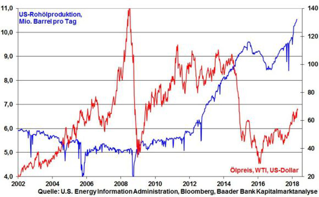 Können steigende Ölpreise zum Spielverderber am Aktienmarkt werden? Das bezweifelt Robert Halver. Der Leiter Kapitalmarktanalyse der Baader Bank macht vielmehr die lockere Geldpolitik für die Aktien-Hausse verantwortlich.Der Ölpreis hat Gemeinsamkeiten mit dem früheren VW Käfer: Er läuft und läuft und läuft. Allein in diesem Jahr ist Öl von seinem Tief um 20, seit Tiefpunkt 2017 bis heute um über 40 und seit Januar 2016 sogar um 170 Prozent gestiegen. Im Augenblick kommt aber auch alles zusammen. Zunächst hat sich die Opec bis Ende 2018 eine Förderbremse verordnet. Daneben sorgen ein mögliches neues Ölhandelsembargo Trumps gegen seinen Lieblingsfeind Iran und Fördereinbrüche in Venezuela geopolitisch für Hochpreisstimmung.