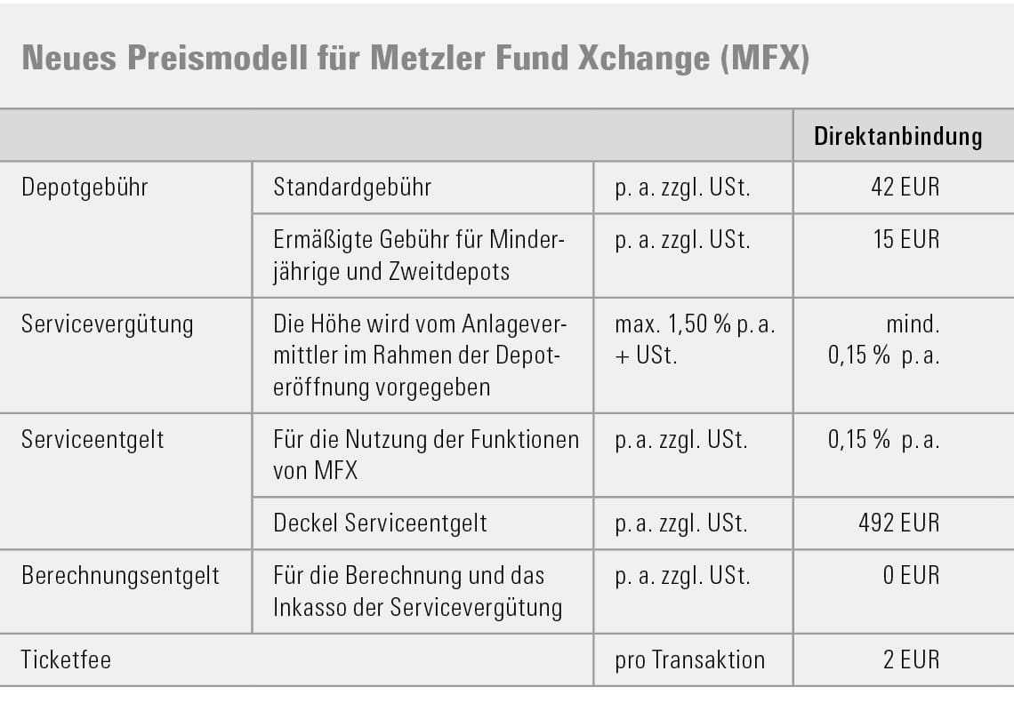 Mit dem Start der Fondsplattform Metzler Fund Xchange in 2002 hat MFX als erste Plattform das Servicegebührenmodell eingeführt. Dabei verhandelt der Anlagevermittler die Höhe der Servicegebühr individuell mit dem Anleger. Doch aus rechtlicher Sicht handelt es sich um eine direkt zwischen dem Bankhaus Metzler und dem Anleger vereinbarte Servicegebühr.