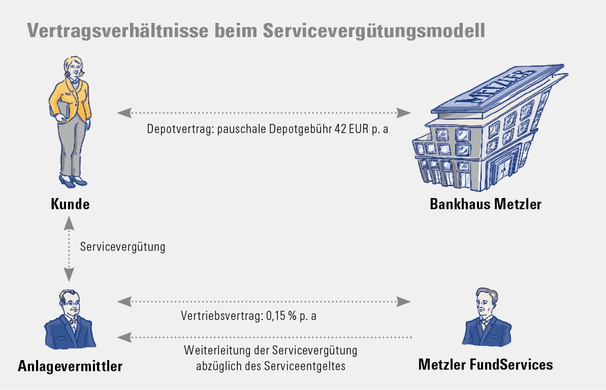 Unter Berücksichtigung des Geschäftsmodells und der erhöhten regulatorischen Anforderungen wurde das bestehende Preismodell modifiziert, damit es auch in Zukunft den Erfolg der Geschäftspartner widerspiegeln kann. Dabei hat Metzler sich von dem Gedanken leiten lassen, ein attraktives Preismodell zu entwickeln, das zugleich für den Kunden transparent ist. Das neue Preismodell beruht im Wesentlichen auf der Servicevergütung. Wie vorher auch, verhandeln Geschäftspartner die Höhe dieser Servicevergütung individuell mit dem Anleger.