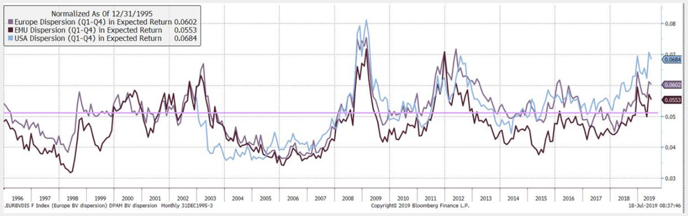 In den vergangenen zehn Jahren waren die Faktoren ‚Value‘, ‚Zyklizität‘ und ‚geringere Qualität‘ (d.h. geringere Rentabilität oder Eigenkapitalrendite) sehr stark mit fallenden Anleiherenditen, sich abflachenden Renditekurven und zunehmender Unsicherheit korreliert. Aktuell sind die Renditekurven flach oder in einigen globalen Märkten sogar invertiert. Gleichzeitig scheinen die Zentralbanken bereit zu sein, die geldpolitischen Bedingungen noch weiter zu lockern und einen neuen, weltweit synchronisierten Zyklus von Zinssenkungen einzuleiten.