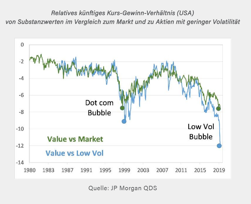Die Analyse von Faktorpositionierung und Bewertungen zeigt, dass Anleger aggressiver als sonst einfach „das kaufen, was funktioniert“. Die Faktoren ‚Momentum‘ und ‚Wachstum‘ waren selten teurer als aktuell. Dasselbe gilt für den Faktor ‚Geringe Volatilität‘, da Anleger vor dem Hintergrund zunehmender Ungewissheit und der durch die große Finanzkrise von 2008 verursachten Risikoaversion in defensive Marktsegmente und Strategien strömten. Anleger scharten sich um hochwertige Wachstumsaktien – man denke an die FAANG-Titel – und wähnten sich für einen Konjunkturabschwung gut positioniert. Könnte man also sagen, dass das Thema Bewertung nun keine Rolle mehr spielt? Was können wir künftig von Substanzwerten erwarten?