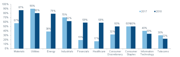 In den einzelnen Industriezweigen ist der Wandel besonders in der Energie-, Finanz- und Gesundheitsbranche spürbar. 79 Prozent der Analysten geben an, dass ESG-Kriterien in der Energiebranche wichtiger werden (2017: 38 Prozent). In der Finanzbranche stieg der Wert von 19 auf 59 Prozent, im Gesundheitssektor von 17 auf 58 Prozent.