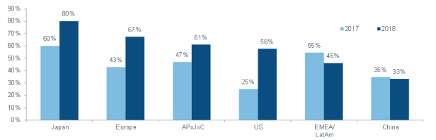 Die deutlichsten Veränderungen sind in Japan zu beobachten: Dort geben 80 Prozent der Analysten an, dass ESG-Kriterien einen höheren Stellenwert in den Unternehmen genießen (2017: 60 Prozent). Auch im asiatisch-pazifischen Raum ohne Japan sowie in Europa und den USA sind große Fortschritte in Sachen ESG zu verzeichnen. China, die EMEA-Region und Lateinamerika hinken jedoch hinterher.
