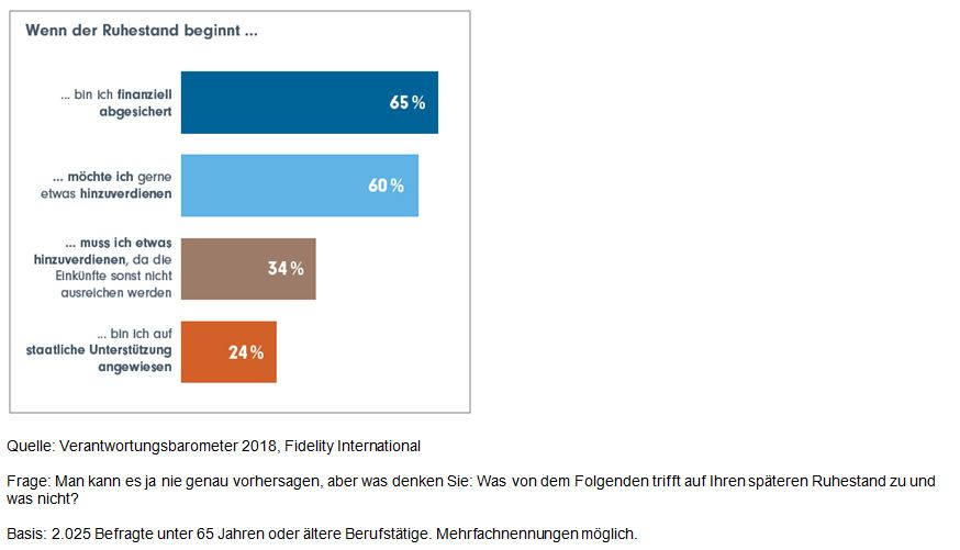 Viele Deutsche fürchten, im Ruhestand ihren Lebensstandard nicht mehr halten zu können. Jeder vierte Bundesbürger unter 65 Jahren geht davon aus, im Alter auf zusätzliche staatliche Unterstützung angewiesen zu sein. Weitere 34 Prozent der Befragten glauben, im Alter etwas hinzuverdienen zu müssen, um über die Runden zu kommen. Das ist ein zentrales Ergebnis des Verantwortungsbarometers Deutschland 2018 von Fidelity International, durchgeführt von Kantar EMNID.