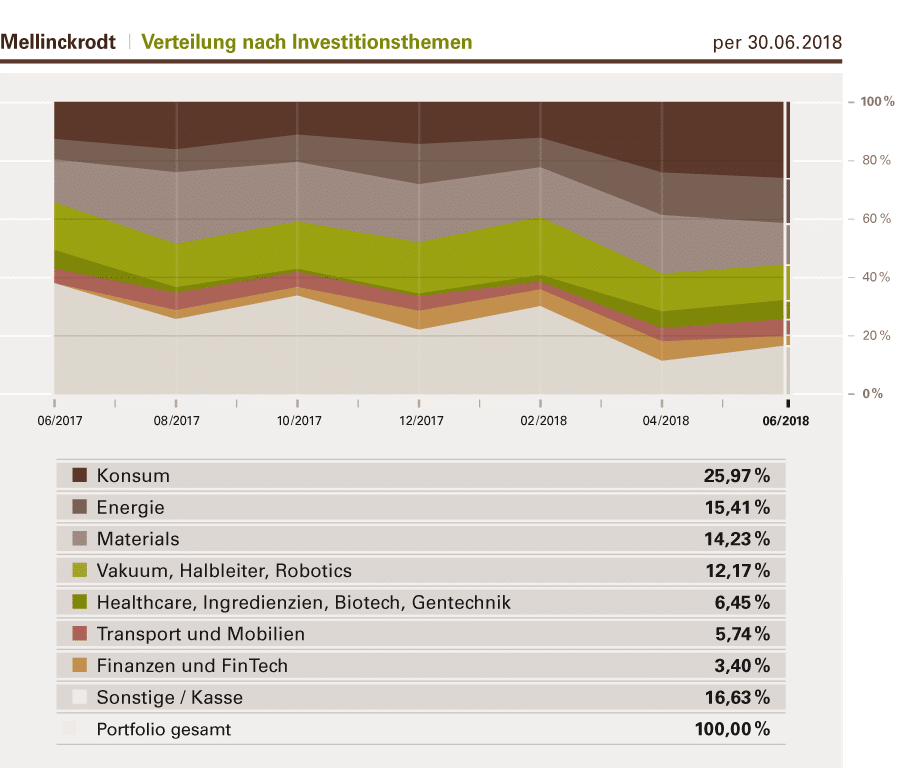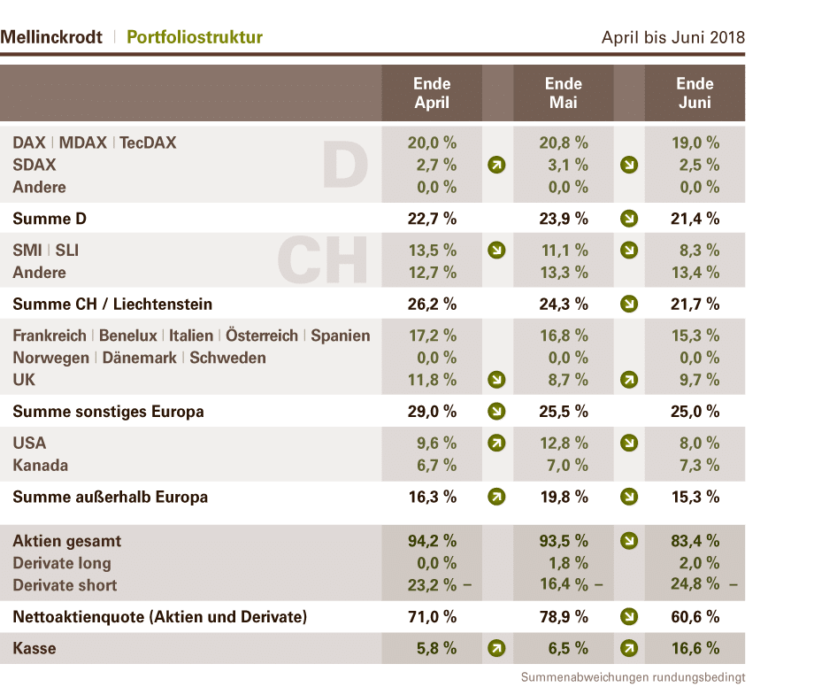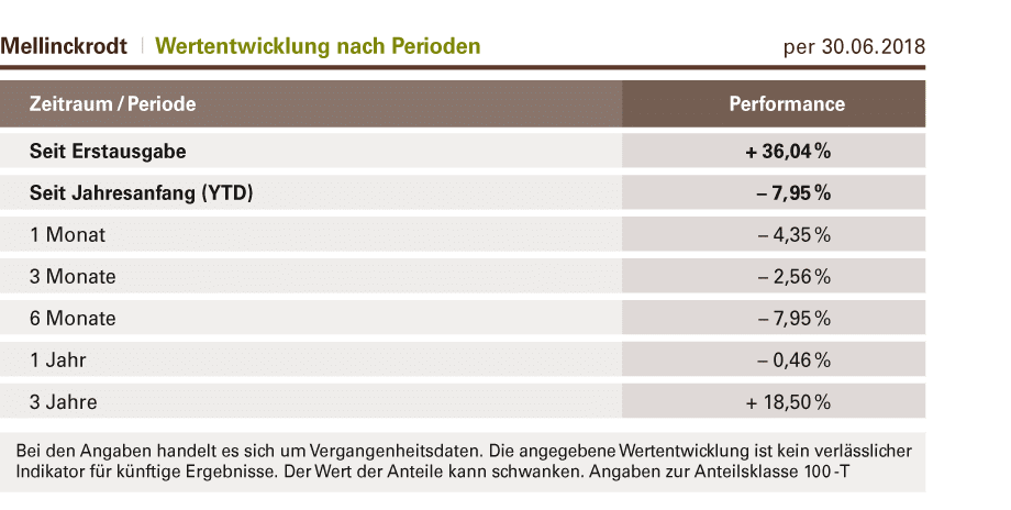 - Mellinckrodt hat im ersten Halbjahr 2018 Verluste hinnehmen müssen. Trotzdem bleibt der Fonds im Dreijahresvergleich im angestrebten Bereich einer Rendite auf dem Niveau der Indizes DAX und Stoxx Europe 600 bei einem deutlich tieferen Risiko (Volatilität).