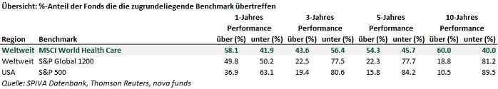 Besser ist das Bild bei Gesundheitsfonds: Im Gegensatz zu brachenübergreifenden Fonds entwickelten sich 58% der Gesundheitsfonds über die letzten 12 Monate besser als der Sektorindex MSCI World HealthCare. Doch auch hier fällt der Anteil der Fonds, die sich über längere Betrachtungsräume besser als der Referenzindex entwickeln. Gleichwohl liegt der Anteil von ca. 44% nach drei und ca. 54% nach fünf Jahren deutlich über den entsprechenden Anteilen der branchenübergreifend investierenden Fonds, wie obige Tabelle zeigt.