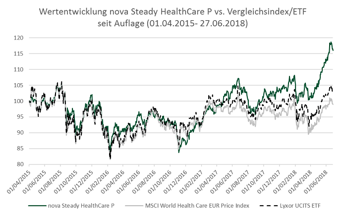 Auch nova Steady HealthCare gehört zu denjenigen Fonds, die den Vergleichsindex bzw. den auf dem Vergleichsindex basierenden ETF im ein- und im dreijährigen Betrachtungszeitraum überlegen sind. So ist die Wertentwicklung der P-Tranche des Fonds in den letzten 12 Monaten ca. 9% besser als die des ETFs (Stand 27.06.2018). Noch besser fällt der Vergleich über 3 Jahre aus: Denn hier schlug der aktiv gemanagte Fonds den passiv gemanagten ETF um 13.6%. Dieses Ergebnis wurde mit einem unserer Ansicht nach sehr attraktiven Rendite / Risikoprofil erreicht: Denn die Volatilität der P-Tranche lag ca. 1,4% unter der der des Referenzindexes bei einem um erfreuliche 19% reduzierten Marktrisiko (Beta von 0,81).