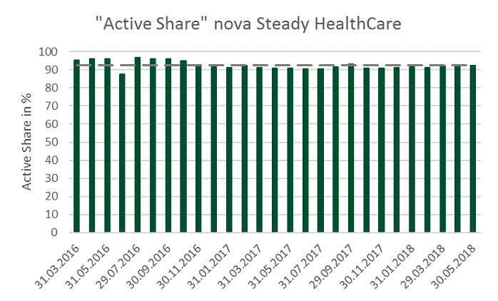 Ermöglicht wurden diese sehr positiven Fondskennzahlen und der für den Fondsanleger generierte Mehrwert durch den aktiven und sehr indexfernen Investmentansatz. Per Ende Mai waren mehr als 92% des Portfolios abseits des Vergleichsindex investiert, wie auch die folgende Graphik zur Fondskennzahl „Active Share“ illustriert.