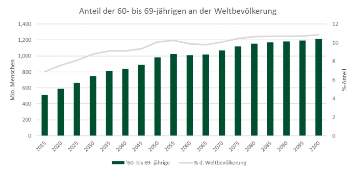 Ein stetig wachsender Markt: Nach Schätzungen der World Health Organization (WHO) leiden 360 Millionen Menschen oder ca. 5% der Weltbevölkerung an Hörverlust.¹ Leider gehört auch eine große Anzahl von Kindern – ungefähr 32 Millionen – dazu. Das gesundheitliche Risiko, unter einem Hörproblem zu leiden, nimmt mit steigendem Alter zu. Eine vor kurzem veröffentlichte US-Studie kommt zu dem Ergebnis, dass in der Altersgruppe der 60- bis 69-jährigen, das Risiko, an Hörverlust zu erkranken, bei ca. 39% liegt. Dies ist fast 5x so hoch wie in der Gruppe der 40- bis 49-jährigen. Der demographische Wandel führt zum Anstieg der Lebenserwartung, weshalb der Anteil der Über-65-jährigen in Deutschland von 21% im Jahr 2013 auf 33% im Jahr 2060 ansteigen soll. Mit einem prognostizierten Wachstum von 3,5% pro Jahr (2018-2023) gehört die Bevölkerungsgruppe der Über-65-jährigen zu der am schnellsten wachsenden. Dieser Trend existiert auch weltweit, wie die nachfolgende Graphik verdeutlicht.