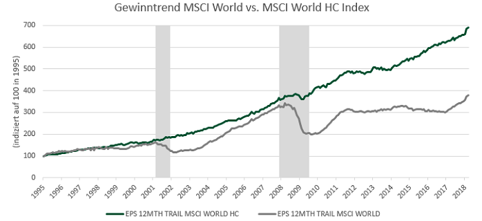 Eine Branche, deren realisierte Gewinne sich über die letzten zwei Jahrzehnte annährend verSIEBENfacht haben (gemessen am Branchenindex MSCI World Health Care). Die Unternehmensgewinne in der Gesundheitsbranche stiegen somit doppelt so schnell an wie die Gewinne derjenigen Unternehmen, die im branchenübergreifenden Gesamtmarktindex MSCI World zusammengefasst sind, wie die nachstehende Graphik verdeutlicht (grau eingefärbte Zeiträume kennzeichnen Rezessionen).