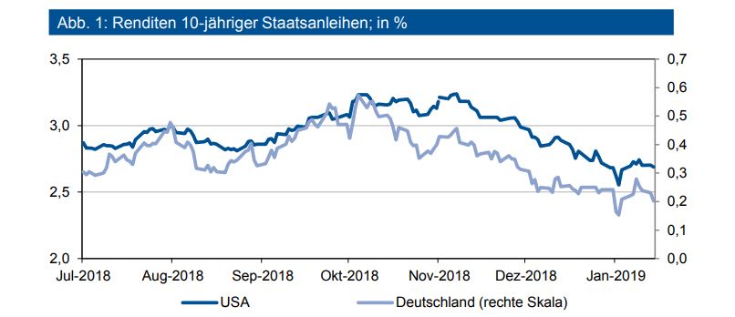 An den Märkten nahm die Risikoaversion deutlich zu, was sich unter anderem in einer Korrektur der Anleihemärkte niederschlug. 10-jährige US-Renditen sind von einem Niveau von 3,15 Prozent Anfang November 2018 auf aktuell 2,7 Prozent gesunken. Auch die deutschen Renditen haben sich von ihrem Höchststand von 0,46 Prozent im November 2018 deutlich verabschiedet. Insgesamt deuten die Anleihemärkte auf eine eher trübe Konjunkturentwicklung hin.